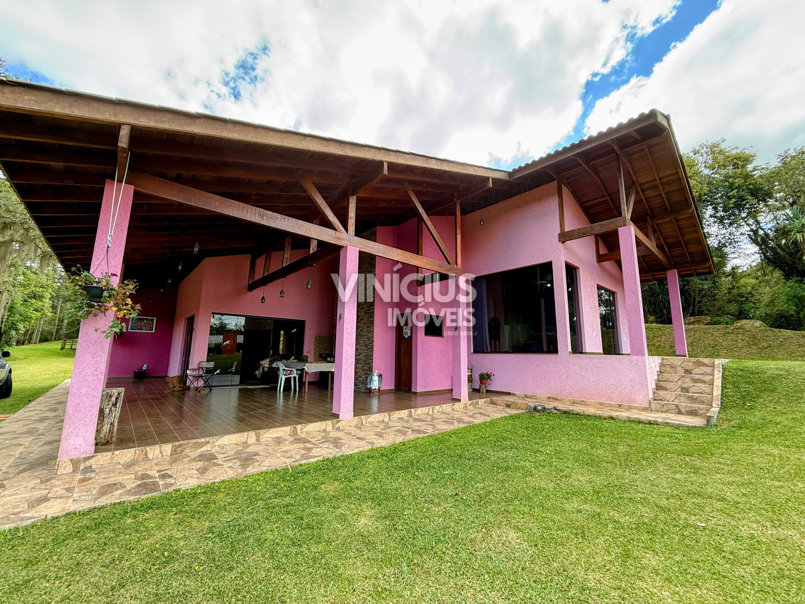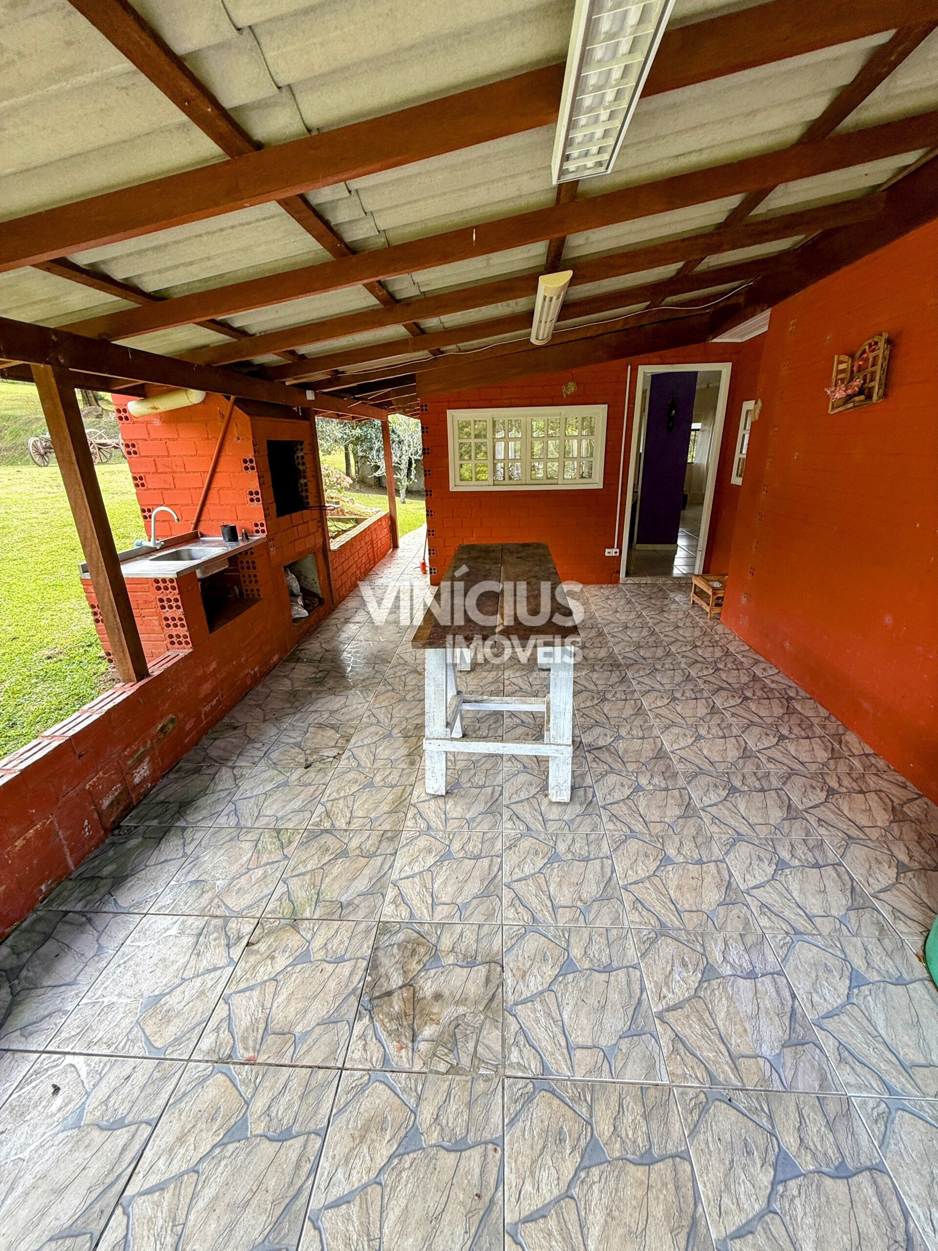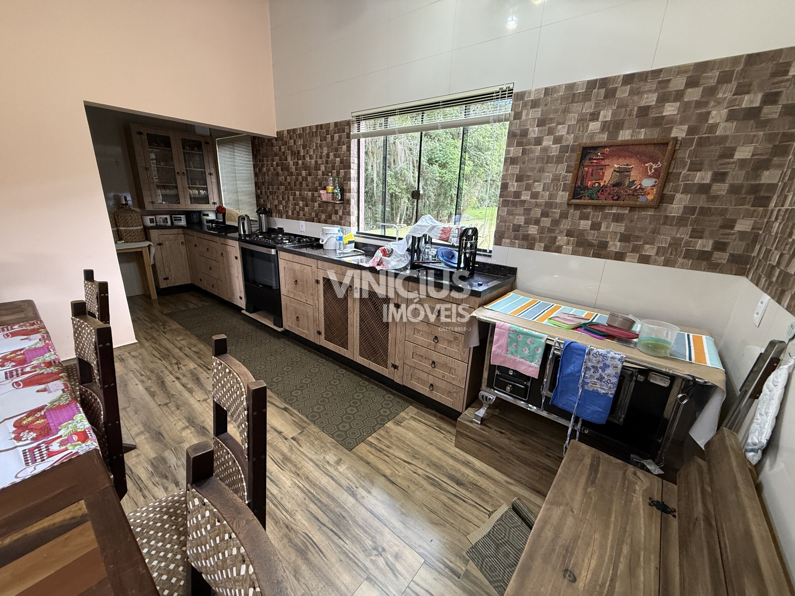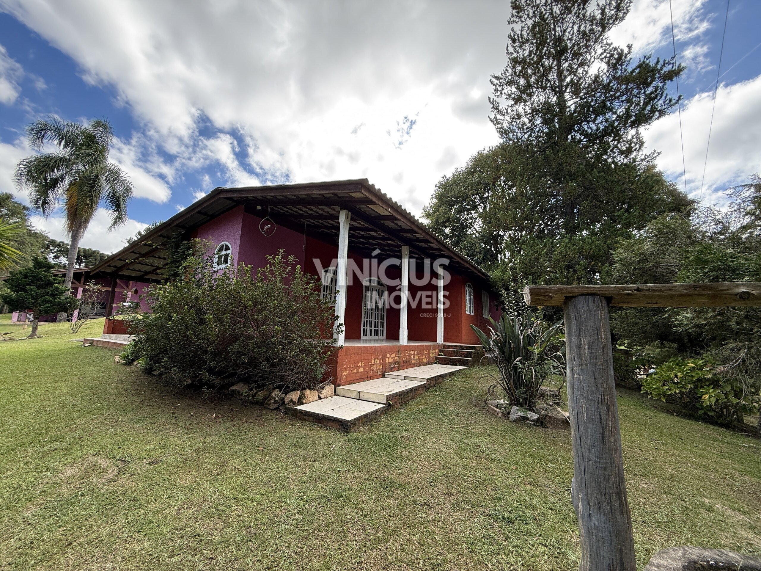 A propriedade conta com duas casas bem estruturadas. A casa principal é nova, com aproximadamente 200 m², oferecendo 3 quartos (sendo 1 suíte), sala e cozinha integradas, três banheiros, acabamento em porcelanato, vidros temperados, laje, sistema de gás, além de churrasqueira, lareira e fogão a lenha, proporcionando conforto em todas as estações.