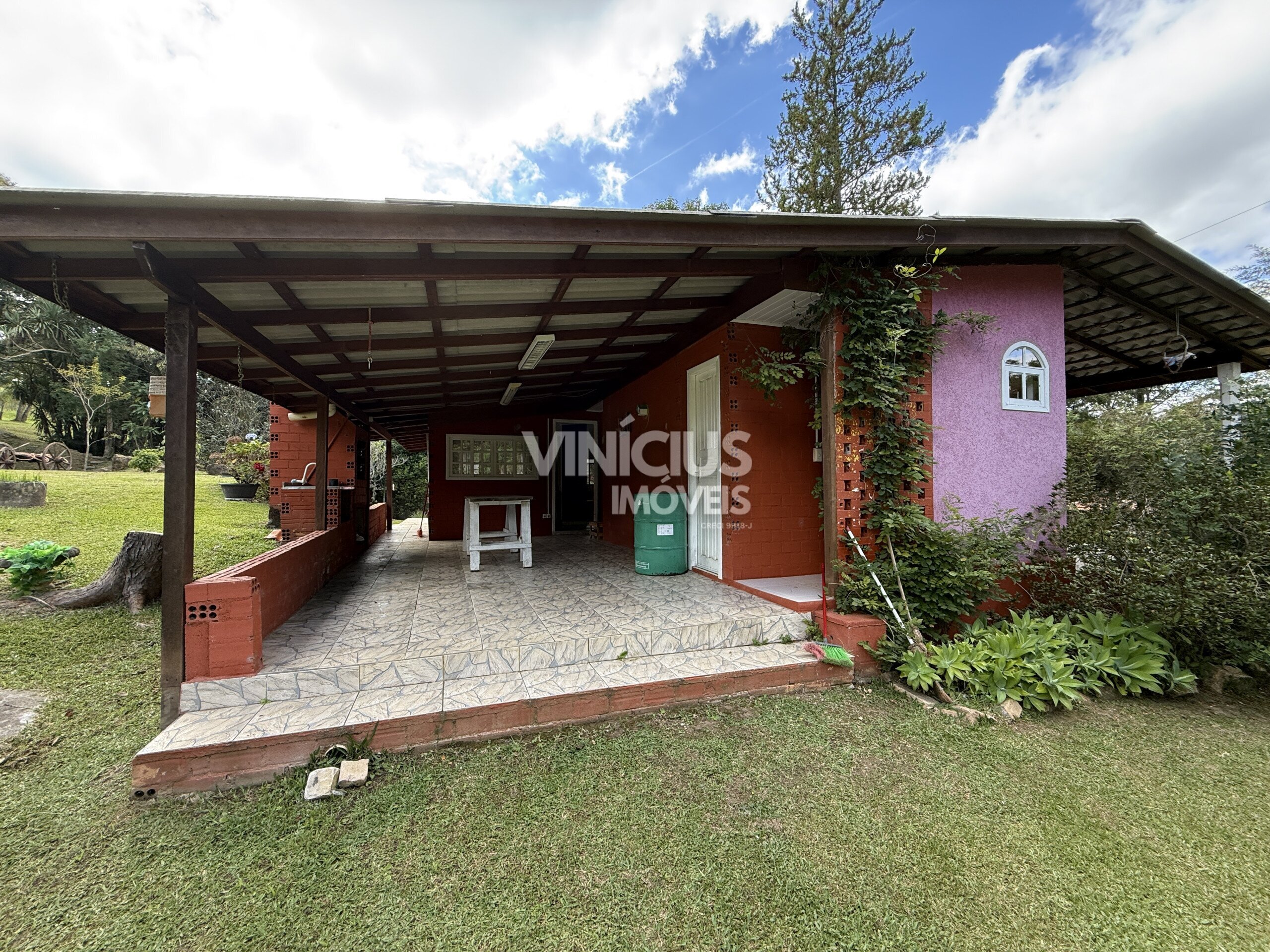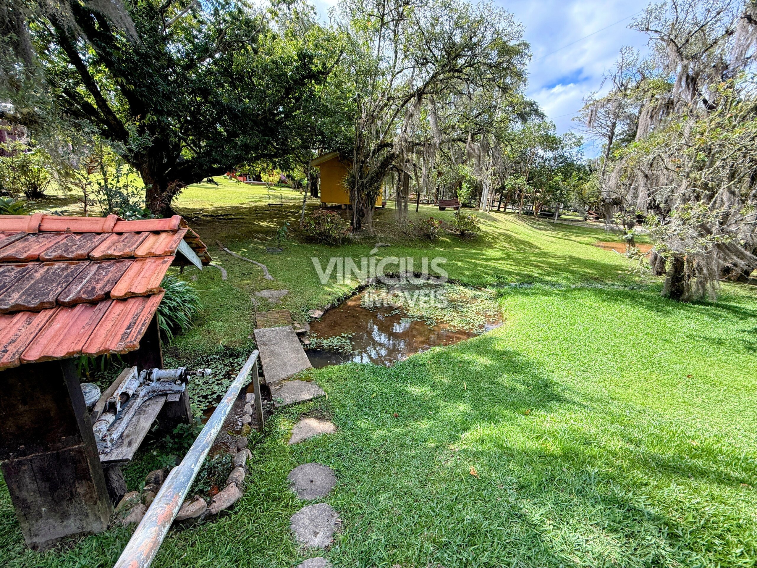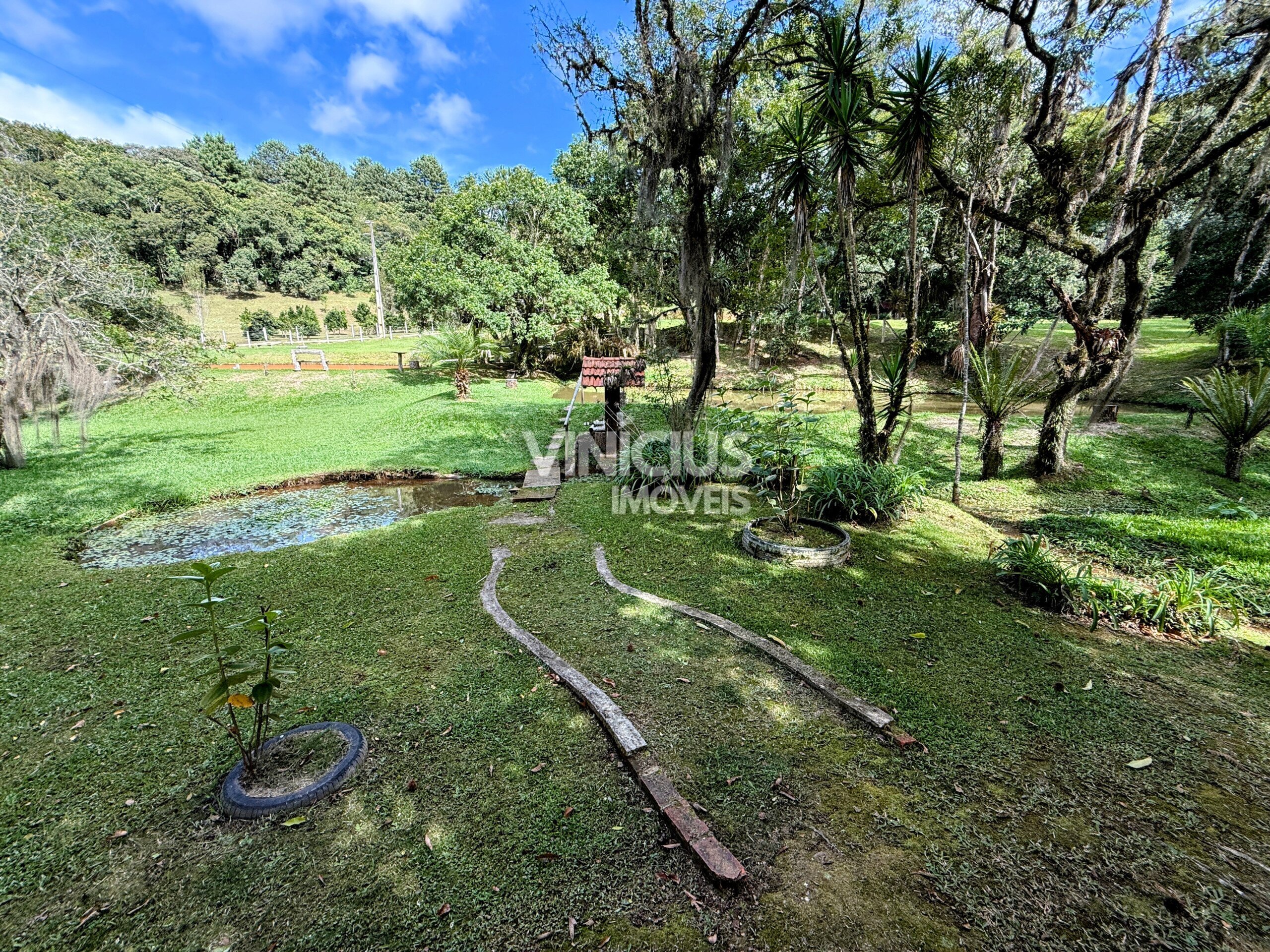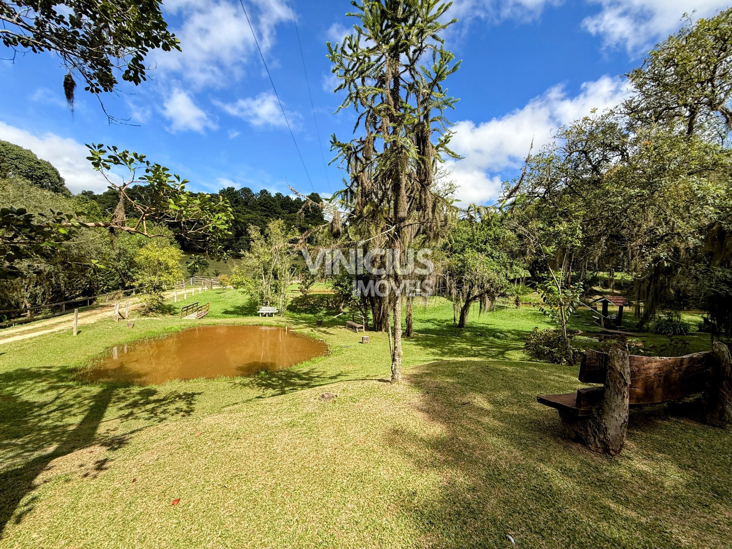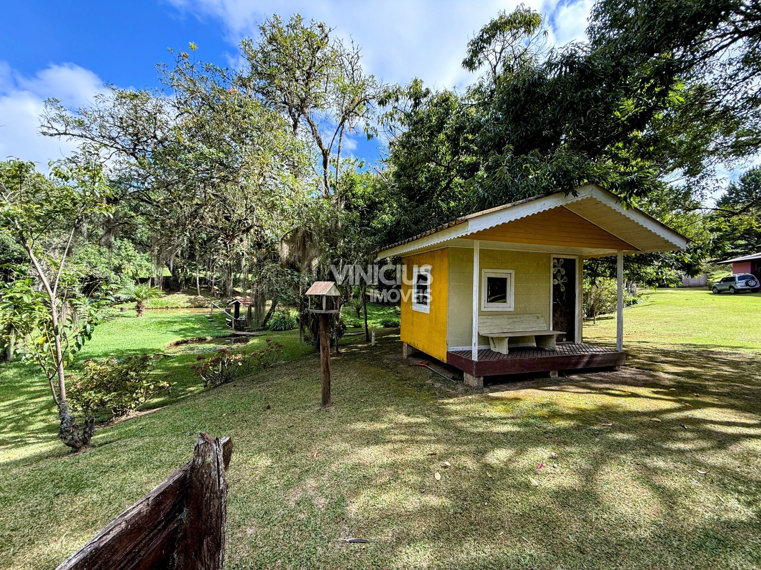 A área externa é um verdadeiro refúgio natural. São 6 tanques com peixes, riacho dentro da propriedade com nascentes, quiosque à beira de um dos tanques, além de paiol, capelinha, casa de boneca e parquinho. O terreno conta ainda com áreas gramadas, mata nativa preservada e espaço para plantio, além de pinheiros e diversas árvores frutíferas.