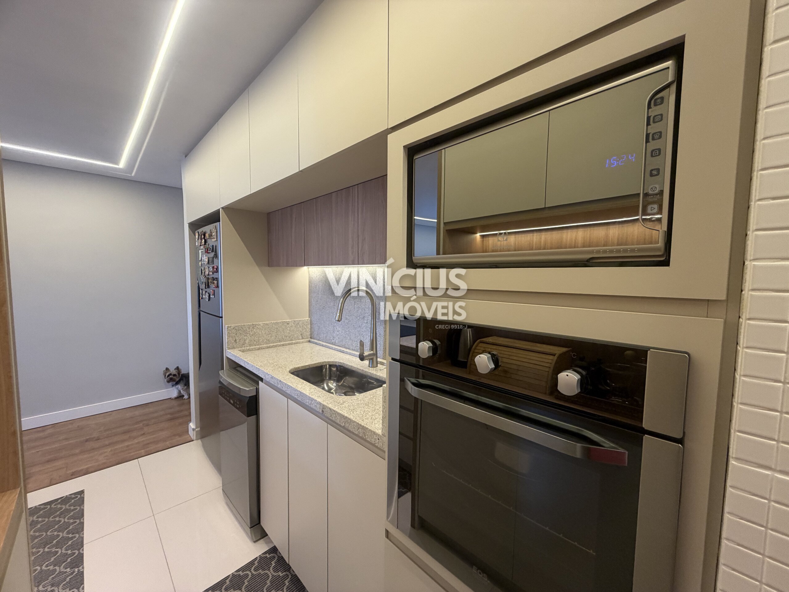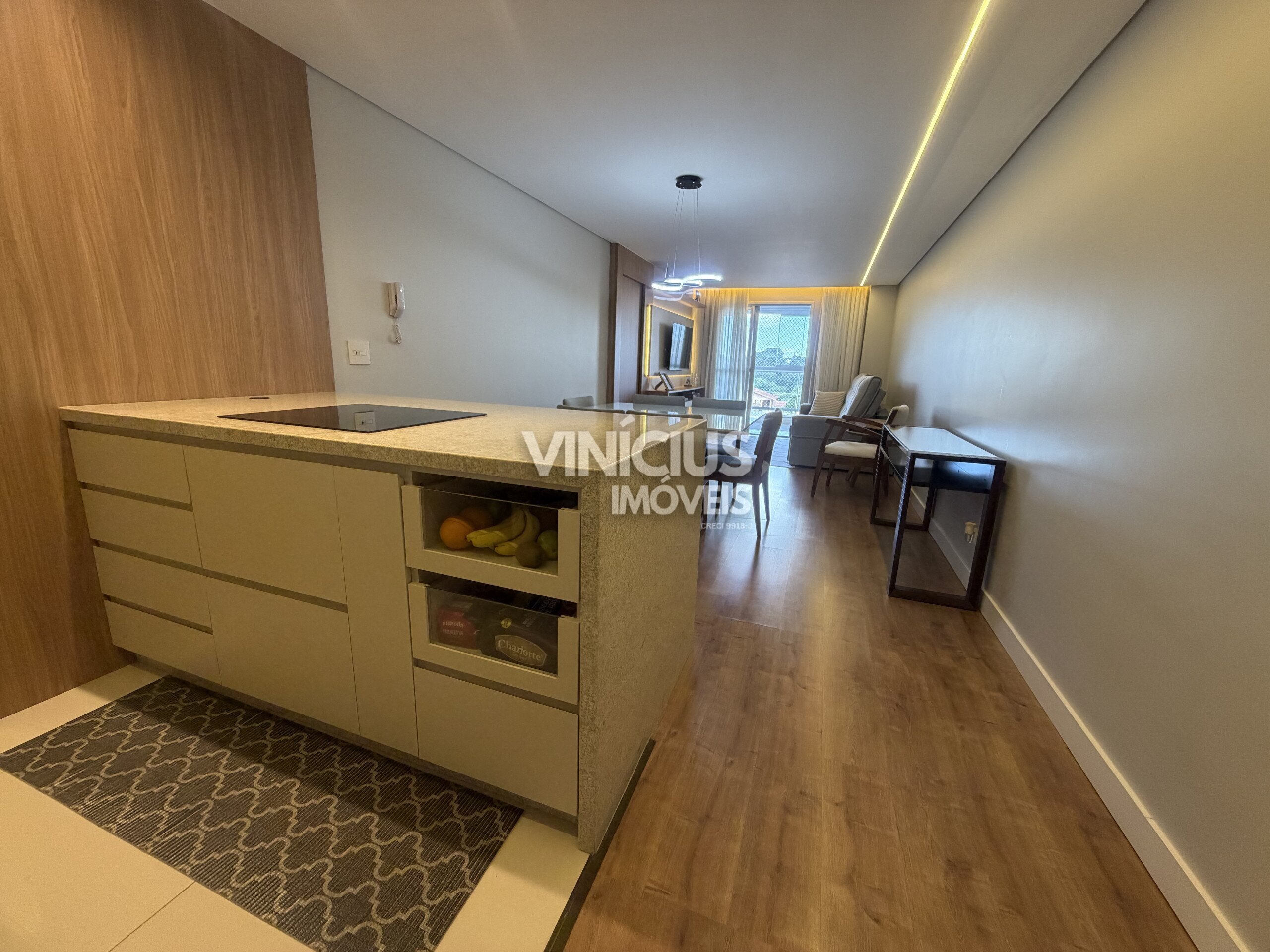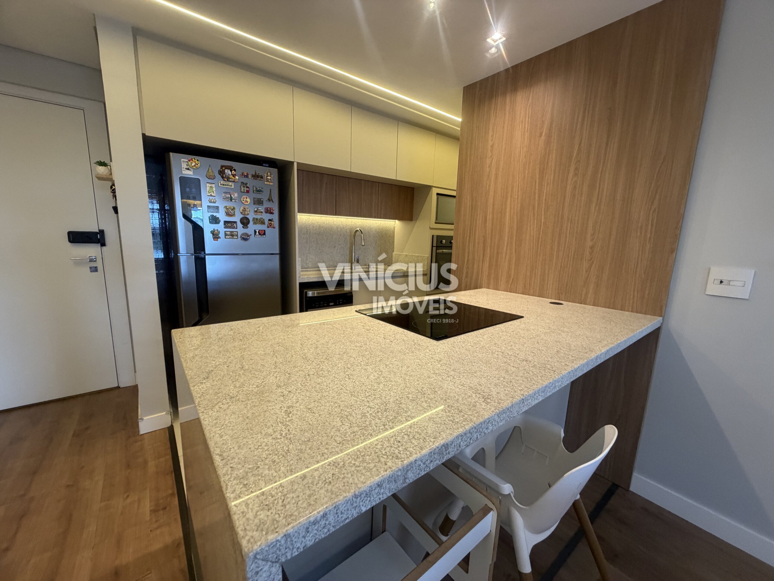 A cozinha — totalmente equipada com móveis sob medida recém-projetados — se conecta de forma harmoniosa com a sala de jantar e estar, proporcionando um espaço ideal tanto para o dia a dia quanto para receber convidados com estilo.