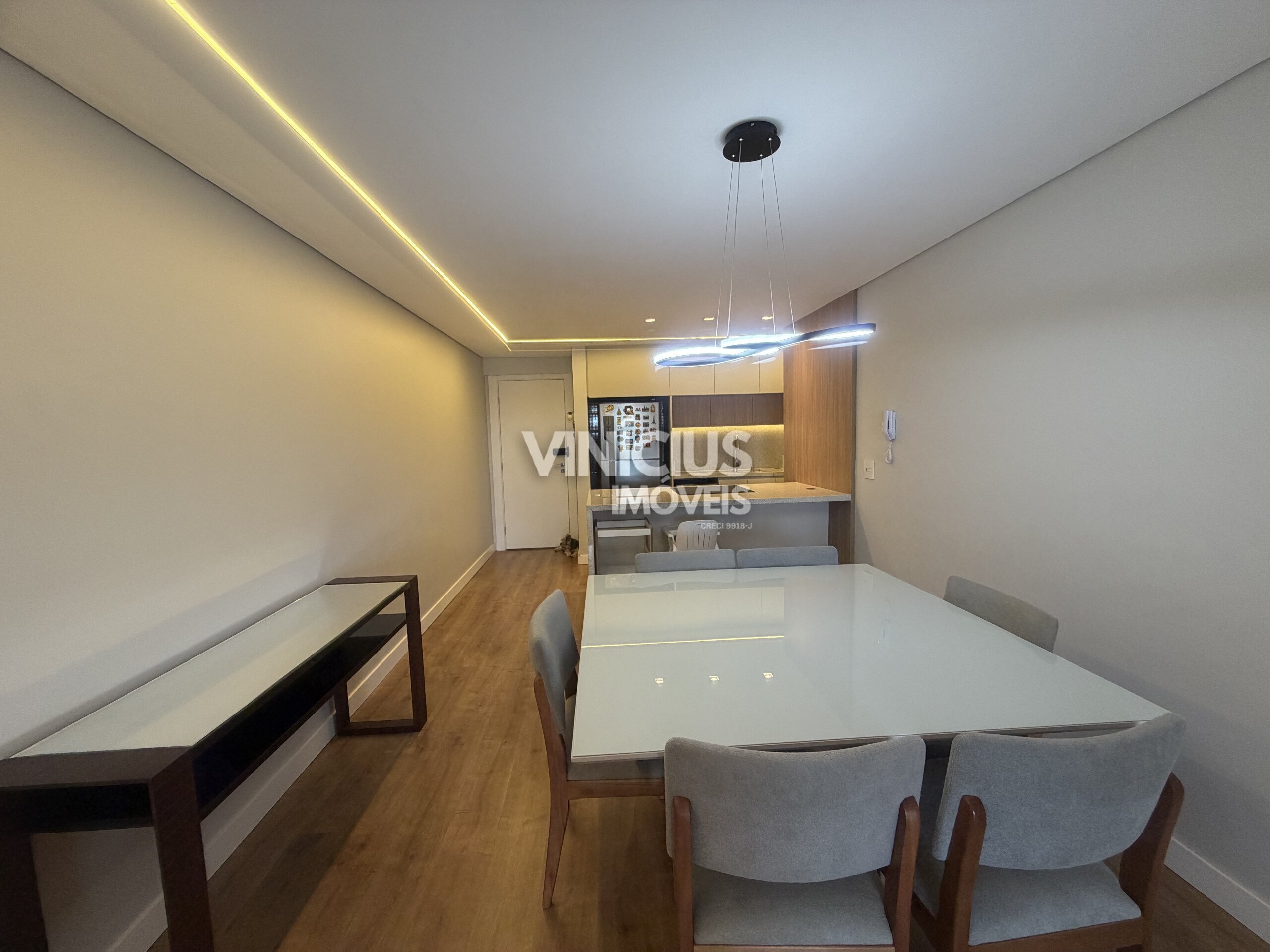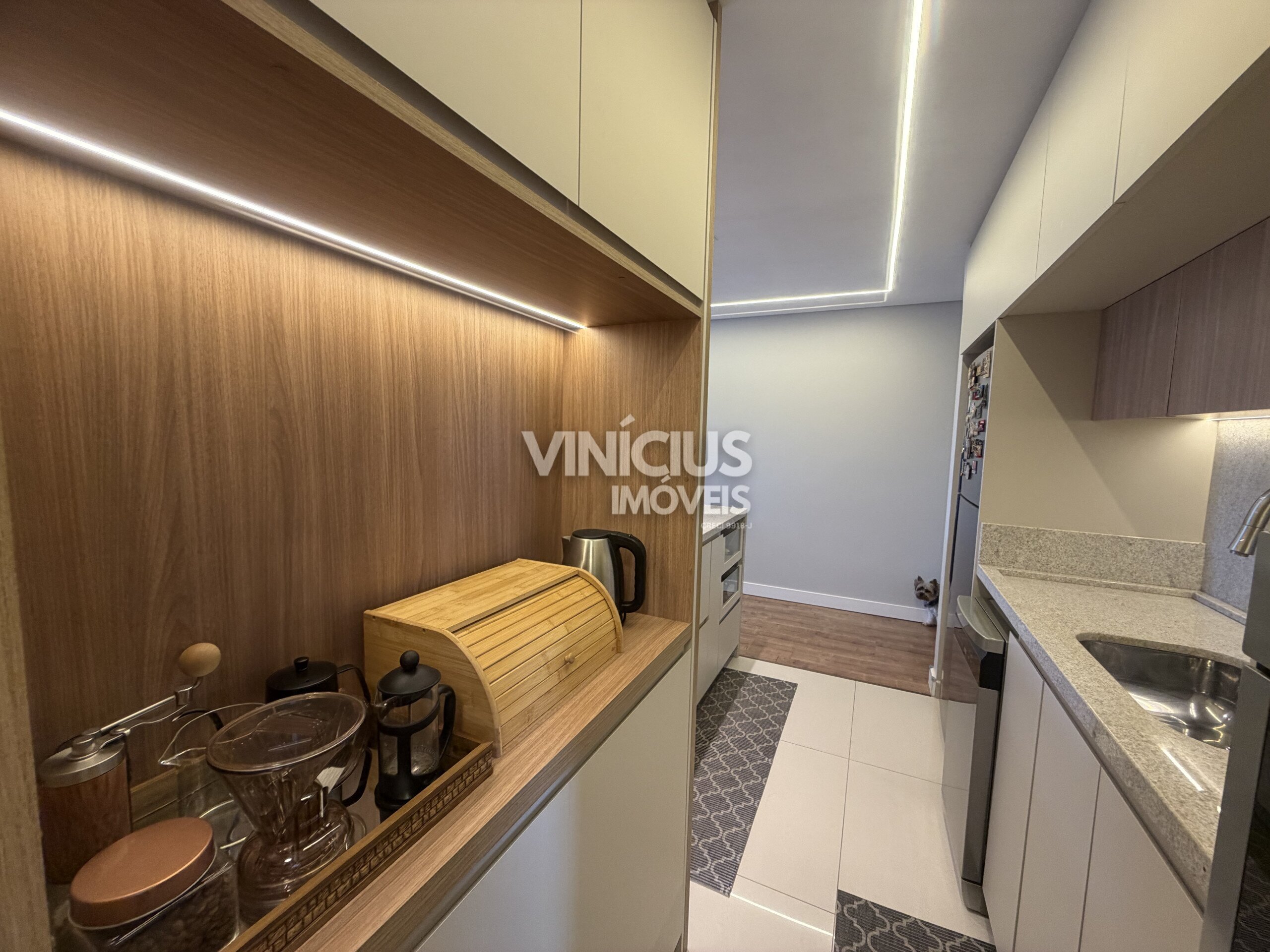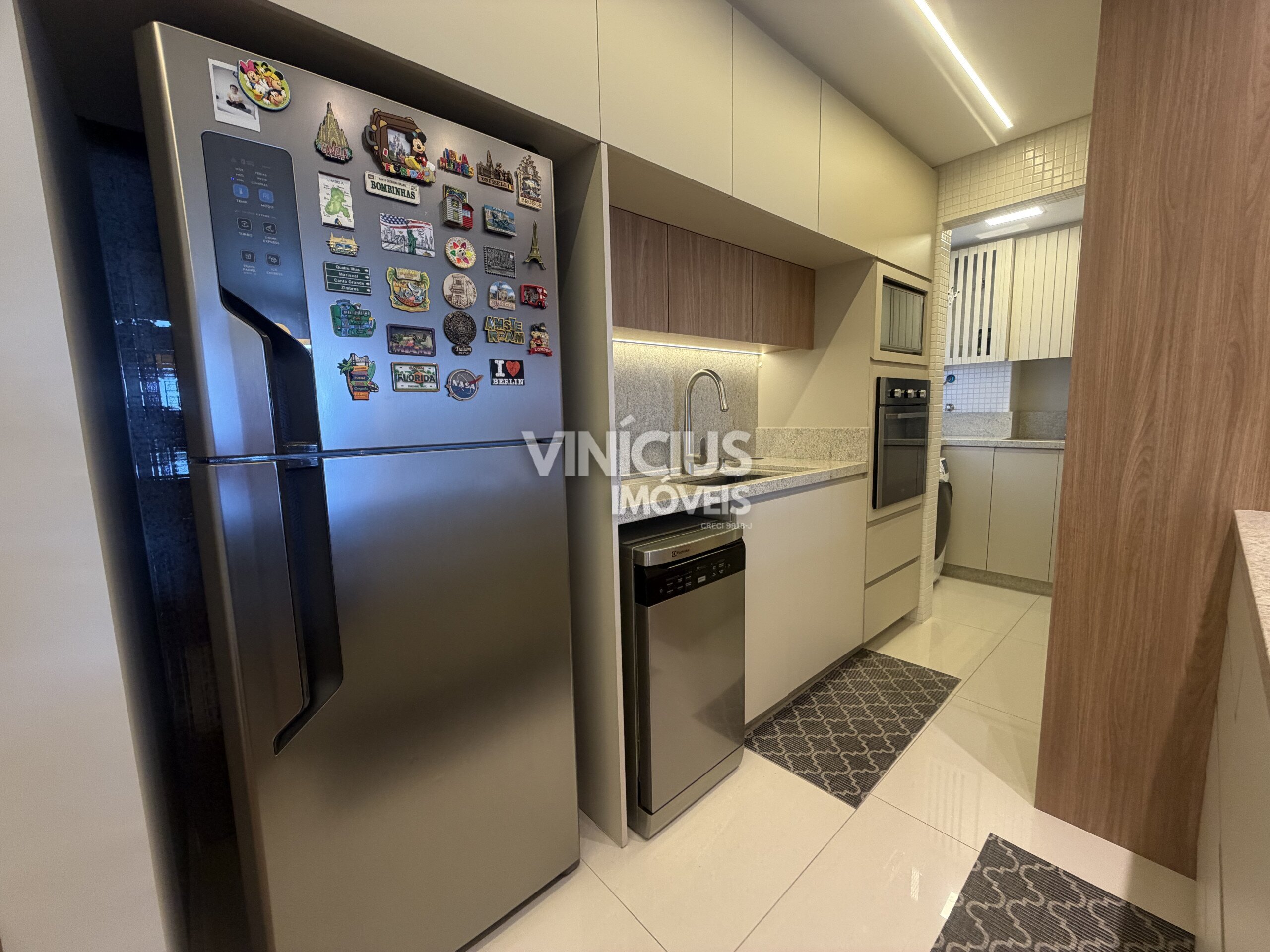 A cozinha — totalmente equipada com móveis sob medida recém-projetados — se conecta de forma harmoniosa com a sala de jantar e estar, proporcionando um espaço ideal tanto para o dia a dia quanto para receber convidados com estilo.