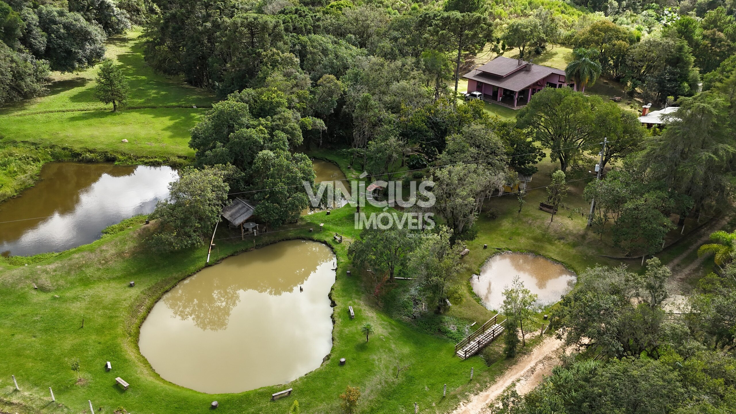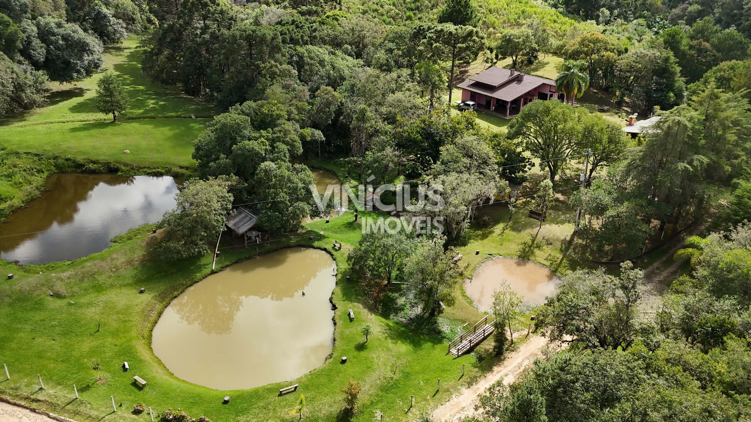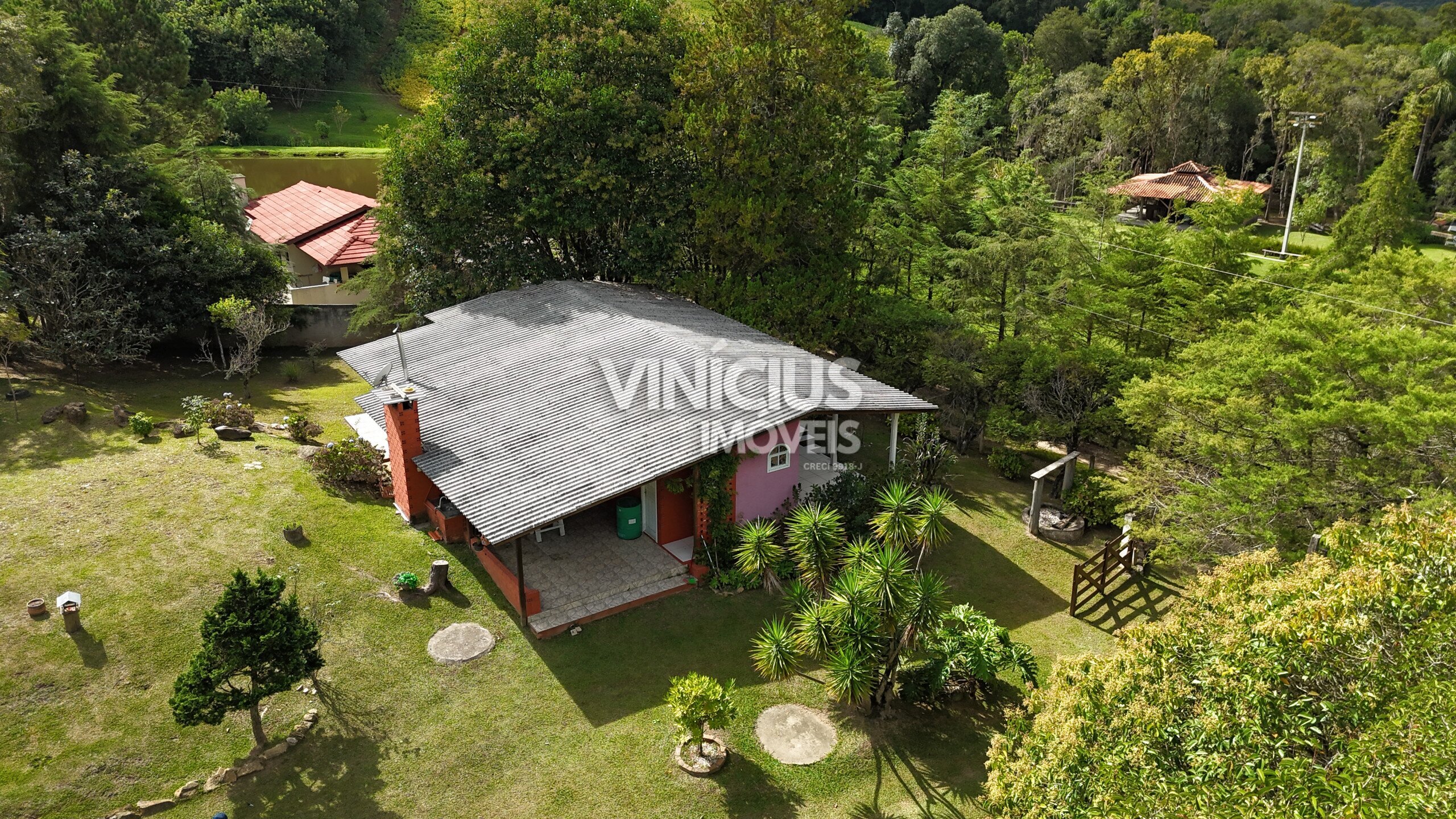 A área externa é um verdadeiro refúgio natural. São 6 tanques com peixes, riacho dentro da propriedade com nascentes, quiosque à beira de um dos tanques, além de paiol, capelinha, casa de boneca e parquinho. O terreno conta ainda com áreas gramadas, mata nativa preservada e espaço para plantio, além de pinheiros e diversas árvores frutíferas.
